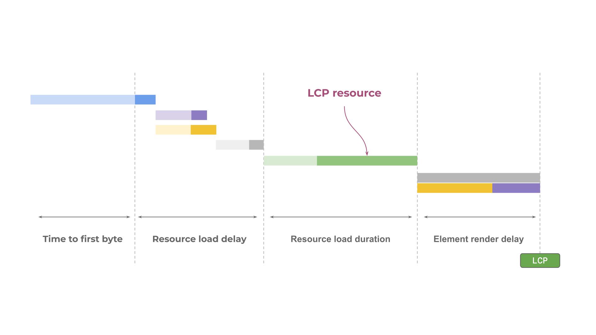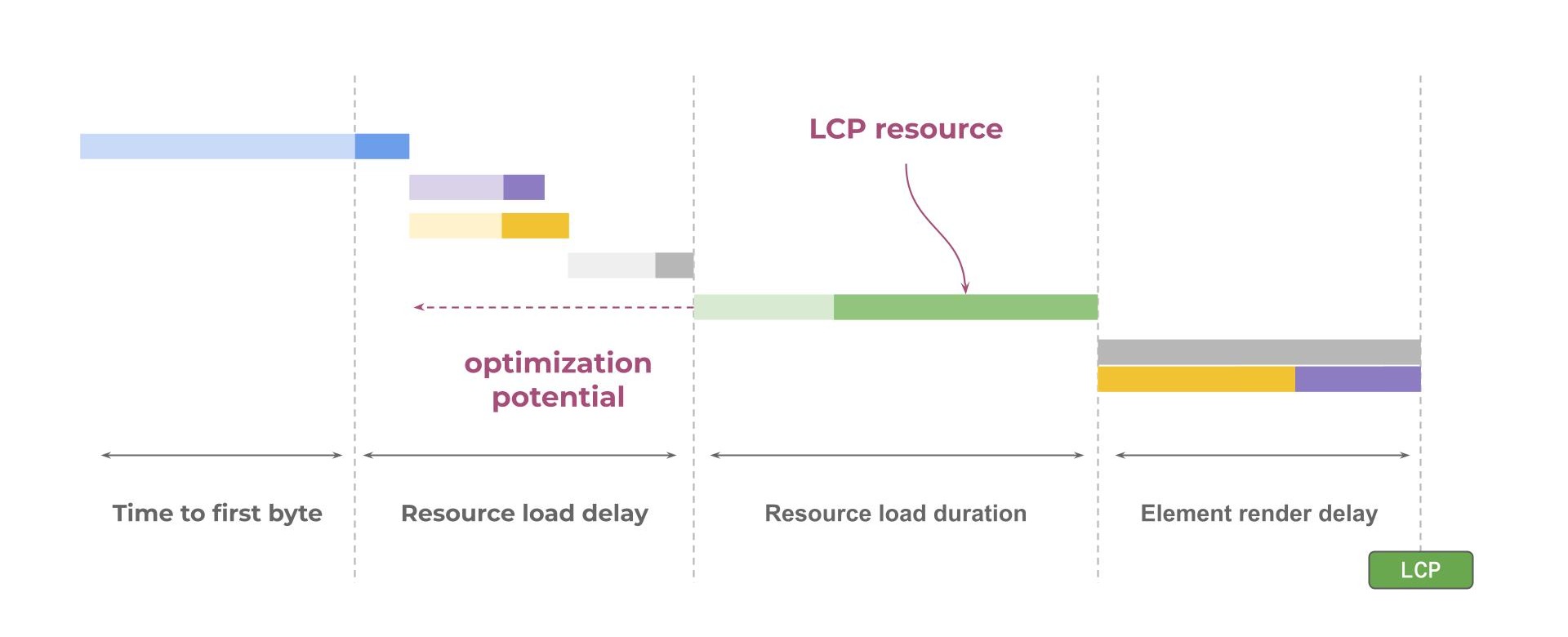 Resource load delay measures the time between the browser receiving the first byte of the HTML and when it starts to load the largest element's resource (e.g., an image file). A significant delay may occur before the browser can discover the LCP element, because it’s busy processing the critical CSS and JavaScript.