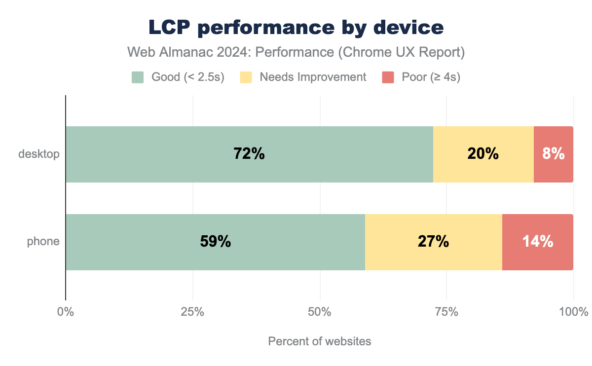 According to the latest version of the Web Almanac, in 2024, 59% of mobile page visits scored a good LCP. Desktop users still scored significantly better with 72% good LCP experiences.