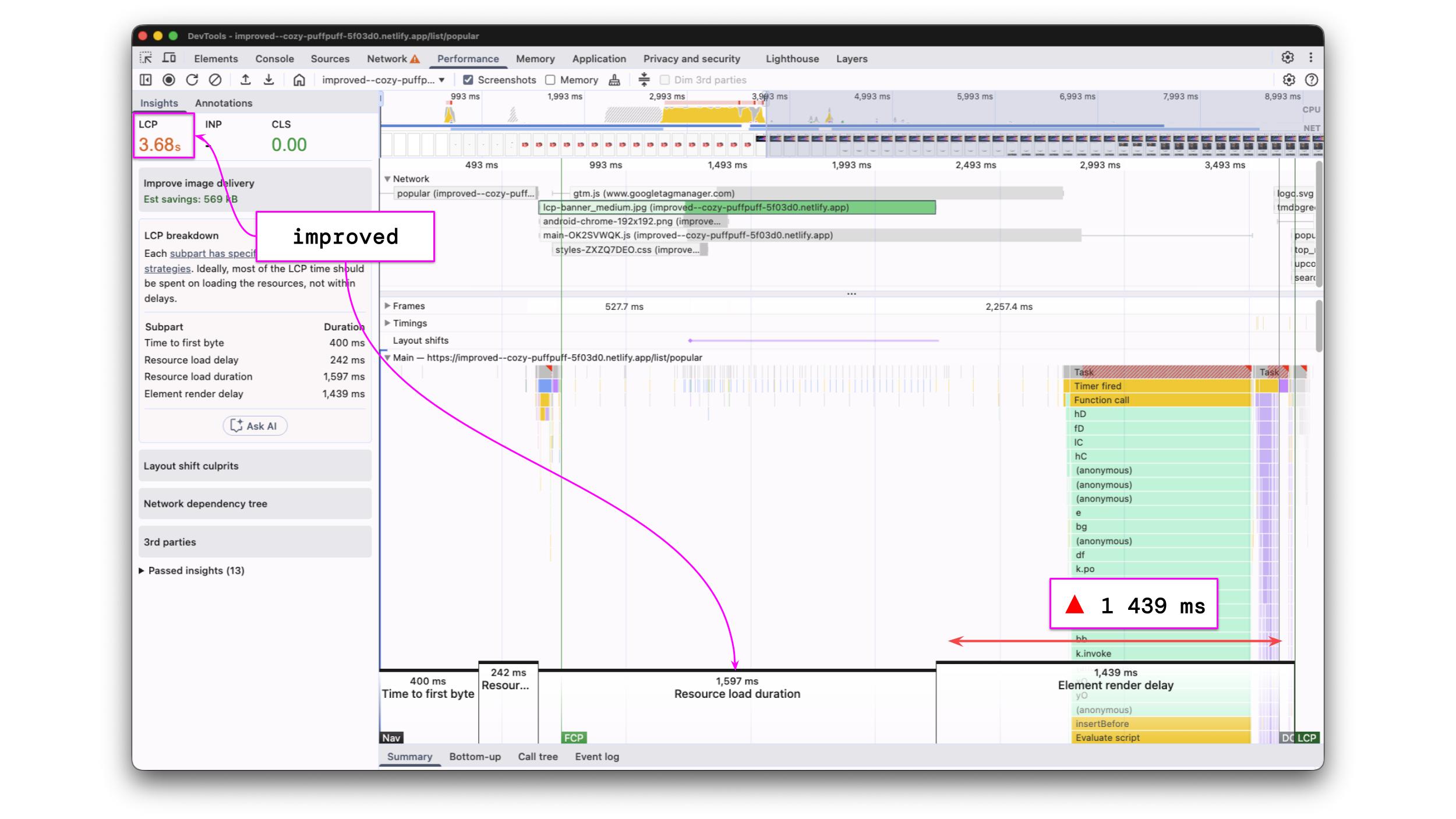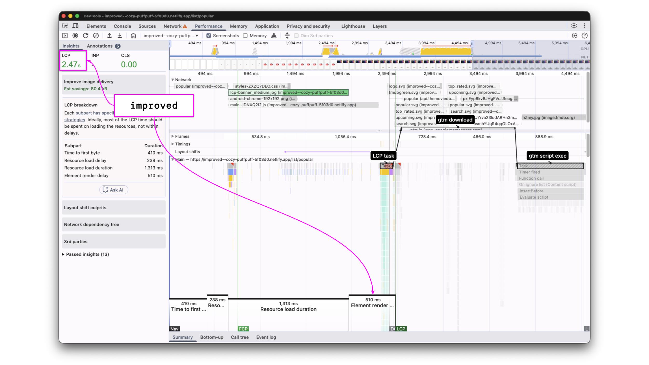 Additionally, the profile is annotated accordingly, and the LCP resource is highlighted. In our case, the LCP resource is lcp-banner_large.jpg