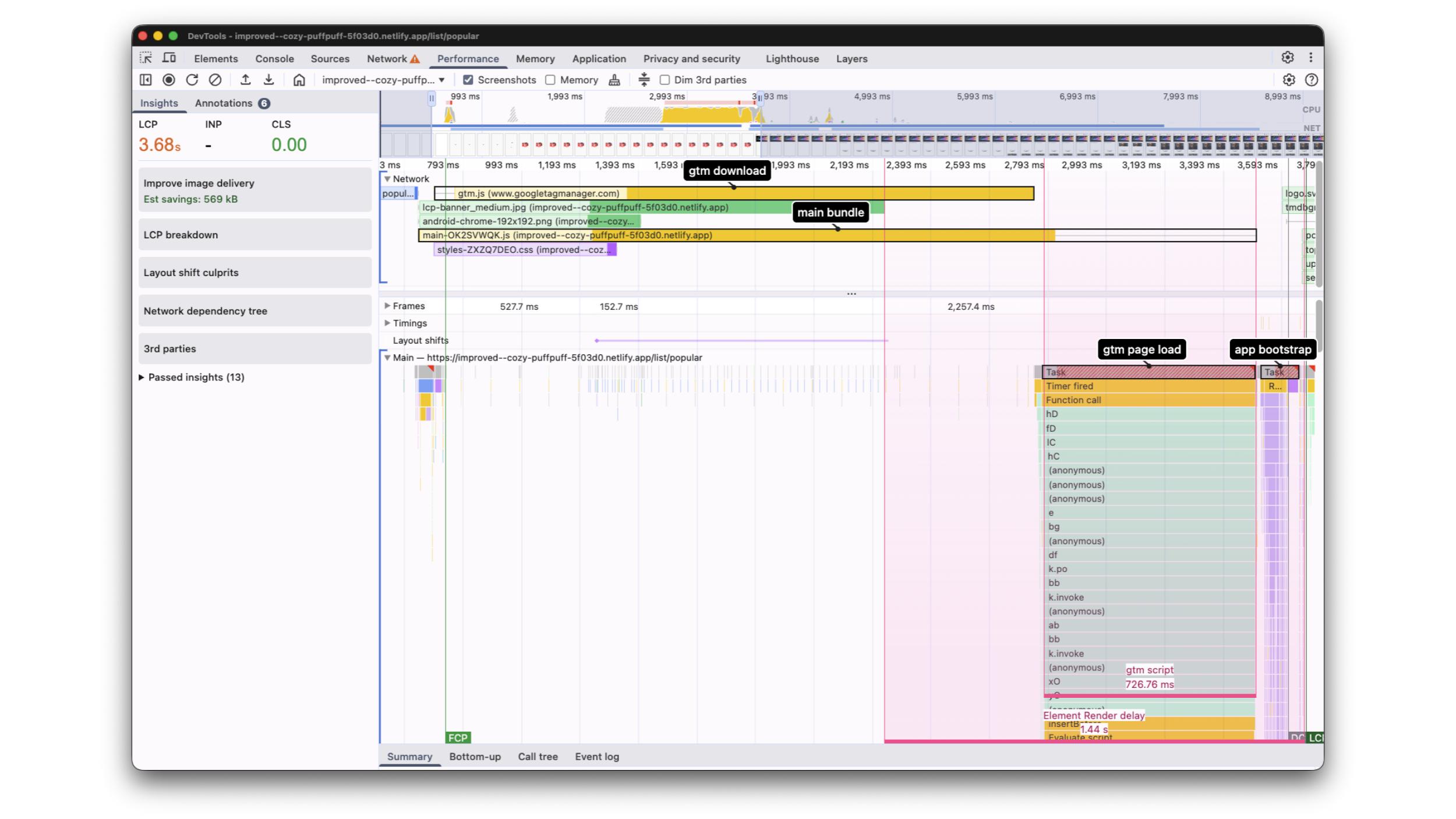 The profile clearly shows how the improvement paid off. The gtm.js script download starts after the LCP event, freeing up network resources as well as the main thread.