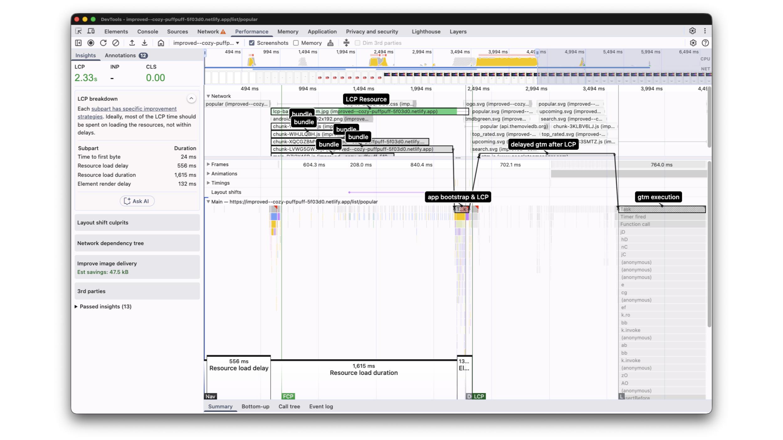 What we should do now is to postpone the GTM script execution after the LCP candidate has been displayed and optimize our JavaScript bundle.