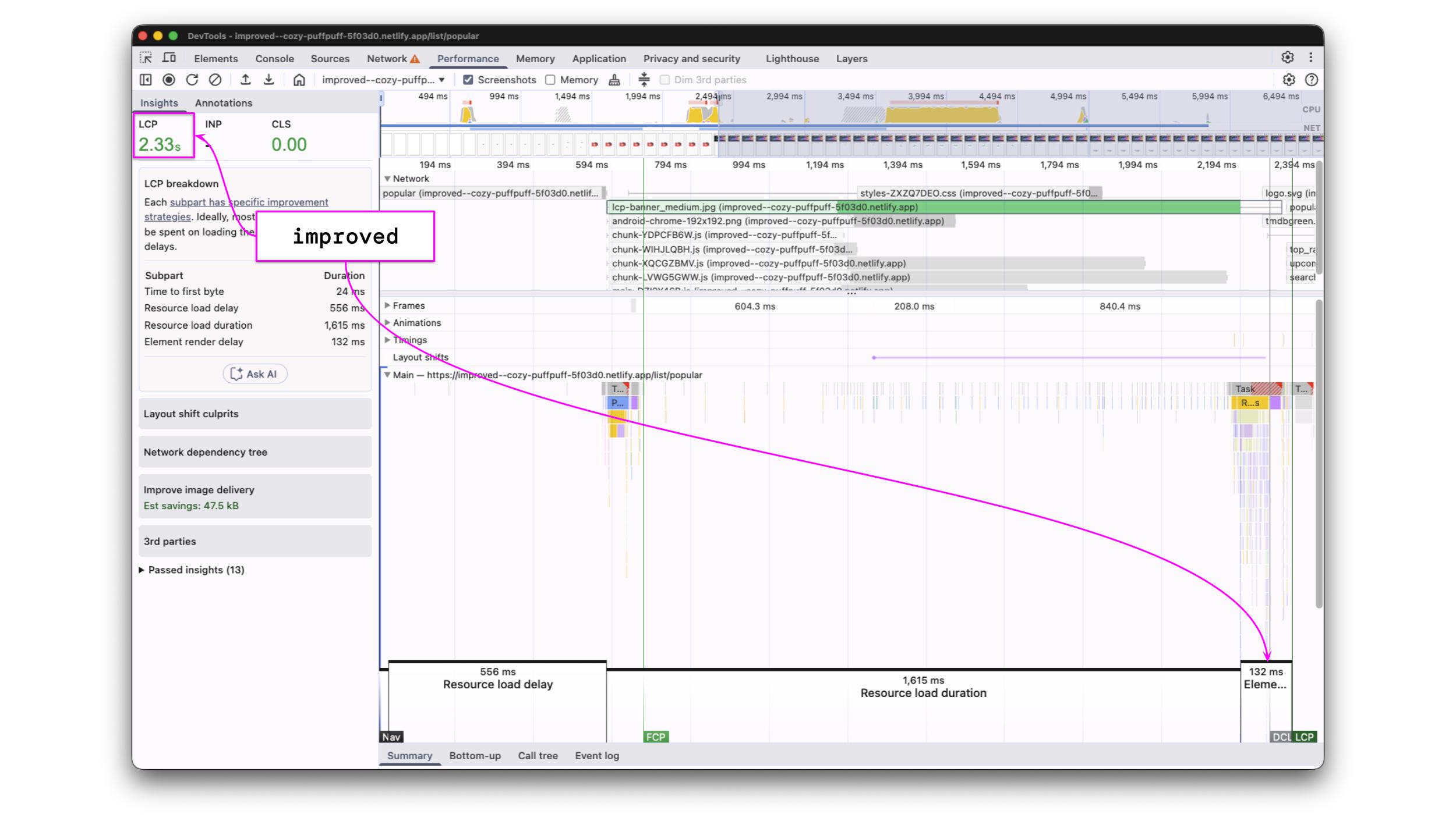 We again confirm the improvement by creating another performance profile and running the LCP by phase audit.
