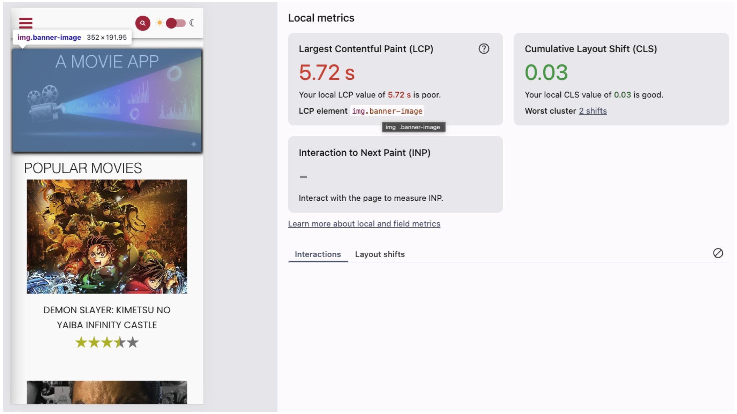 In the case of LCP, the live metrics also show the element that gets reported as LCP. In this example application, it’s img.banner-image